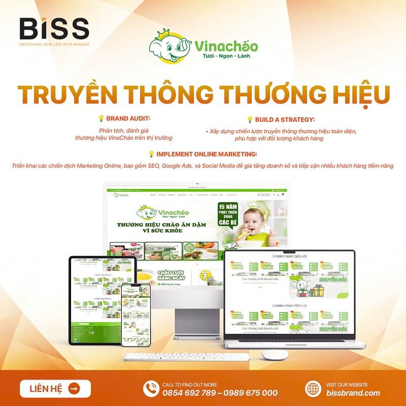 Biss Brand đã xây dựng chiến lược marketing tổng thể phù hợp với mô hình chuỗi của VinaChao. Chúng tôi tối ưu website, định hướng lại nội dung đa kênh và triển khai các chiến dịch marketing online đồng bộ. Nội dung tập trung vào giá trị sản phẩm, độ tin cậy và trải nghiệm khách hàng. Sau triển khai, VinaChao gia tăng độ nhận diện thương hiệu và khả năng tiếp cận khách hàng tiềm năng. Hoạt động marketing hỗ trợ hiệu quả cho việc mở rộng hệ thống điểm bán.